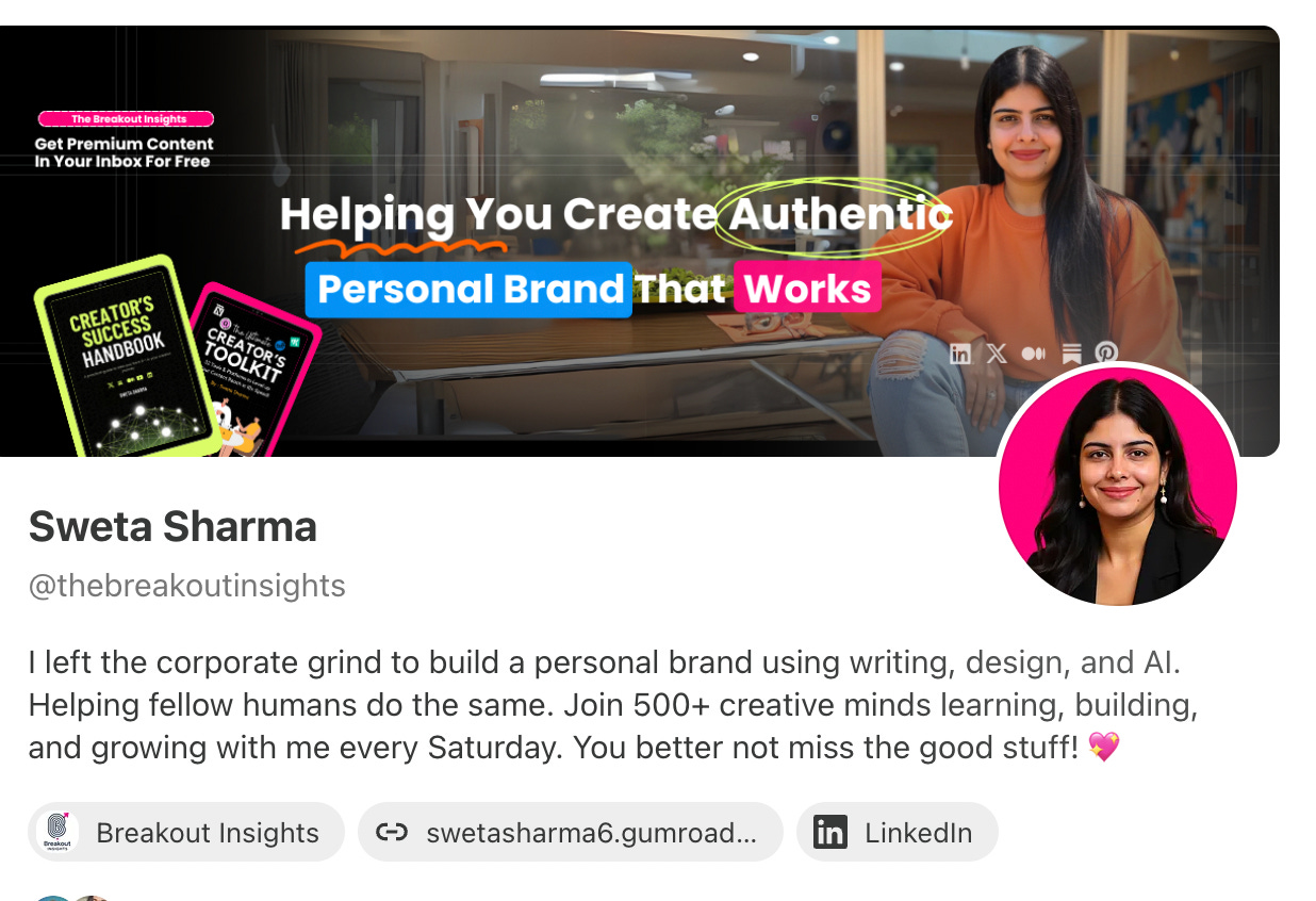 Sweta’s banner is doing a lot in a small space but it works. She tells you clearly what she does (“Helping you build an authentic personal brand that works”) and backs it up with visuals of her own guides and content. She even includes a note about free content in your inbox, which plants the seed for trust. It’s clean, confident, and direct. If your work blends personal storytelling with content or coaching, this is a great format to learn from.