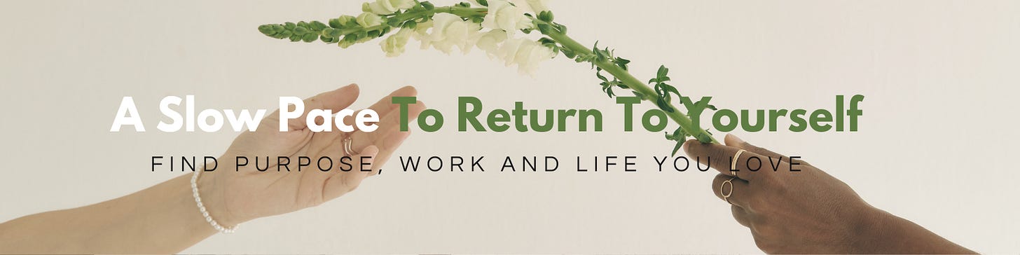 “Design a minimalist Substack banner (1200×400) with a sage green to lavender gradient. Add left-aligned serif font that says ‘A slow pace to return to yourself.’ Leave white space on the right for profile image. Style: reflective, soft, calm.”