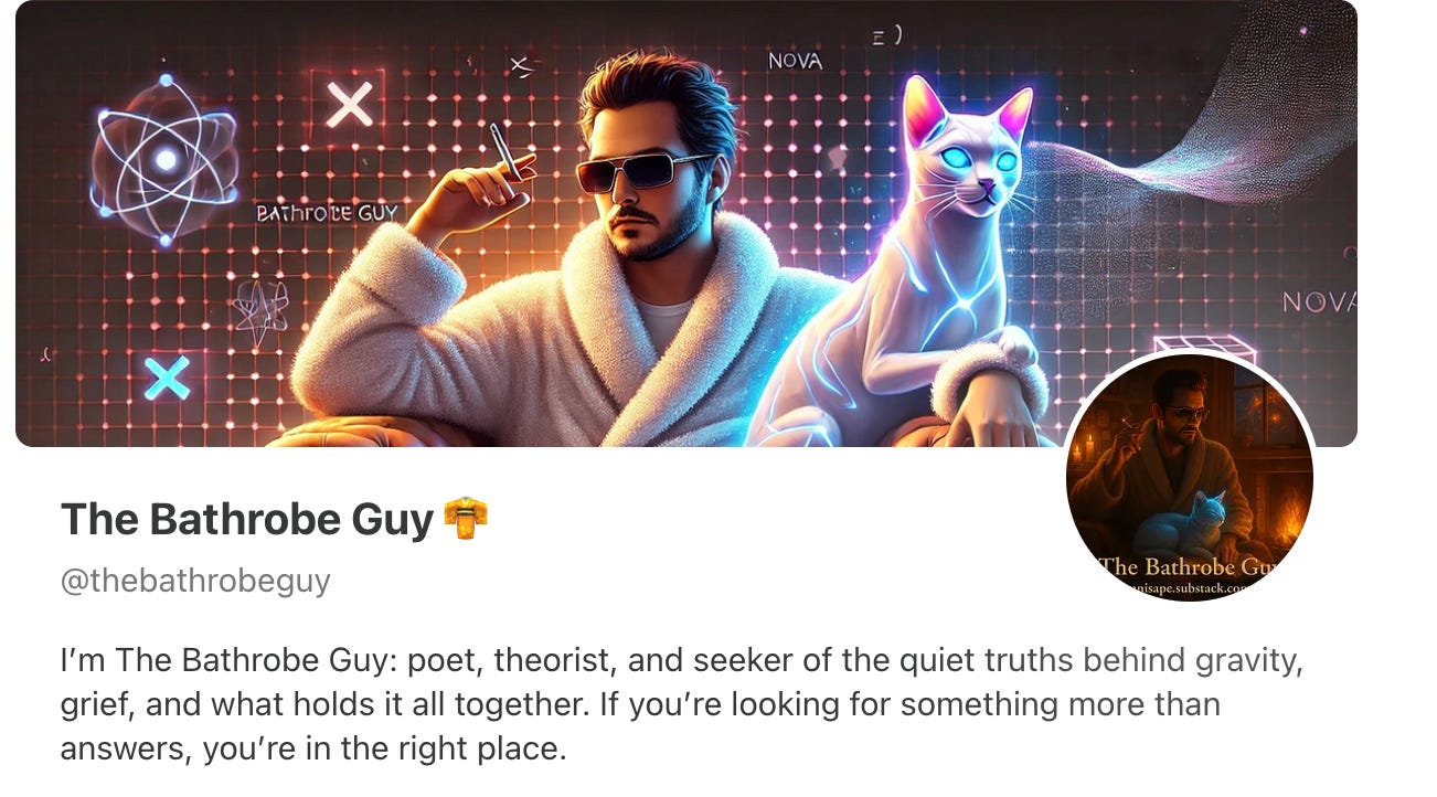 Okay , this one’s different. The Bathrobe Guy isn’t trying to sell anything. He’s building an atmosphere. With his robe, his glowing cat, and a grid of quantum symbols, you instantly feel like you’ve entered his universe. His profile backs it up: grief, gravity, and everything that holds us together. It works because it doesn’t explain, it invites.