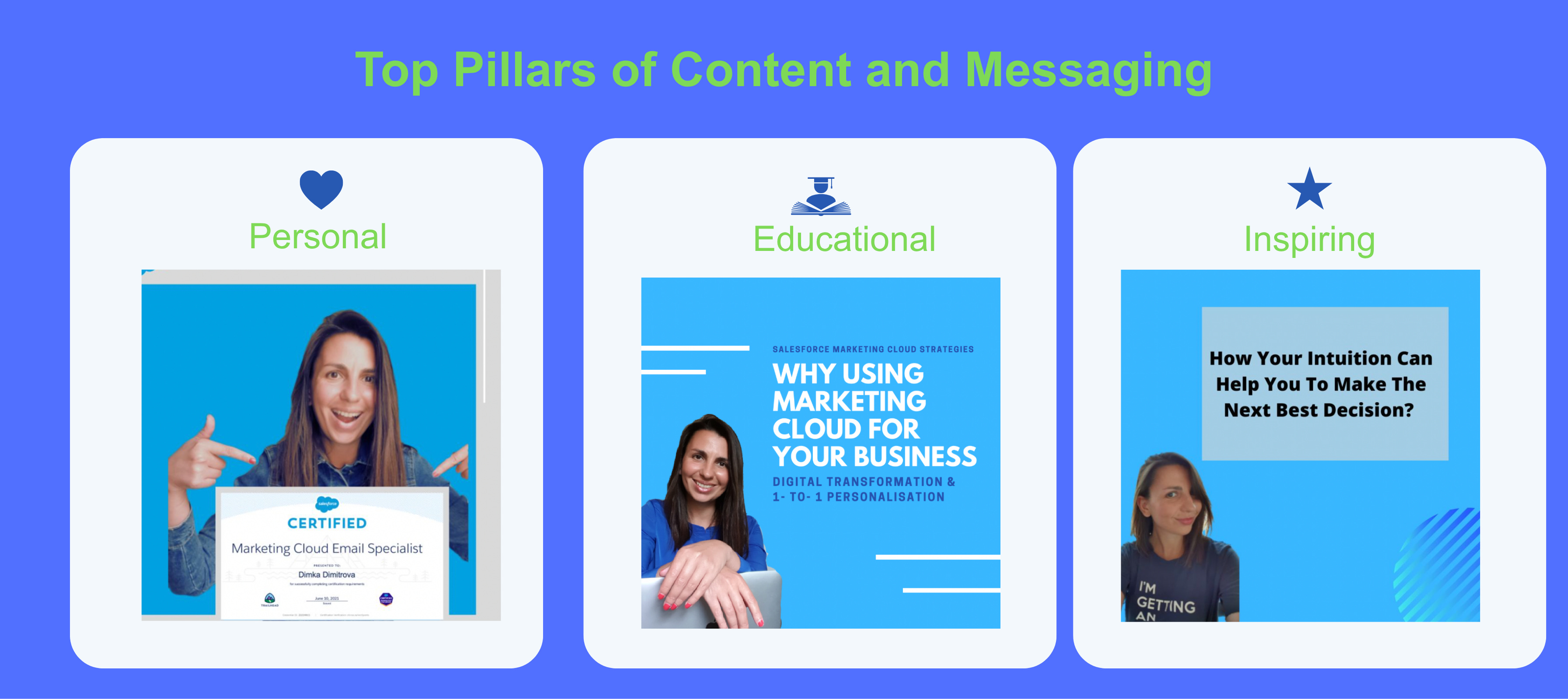 I created a brand that aligned with the company I wanted to work for, but filtered through my own creativity and voice. My core content pillars were personal, educational, and inspiring, and I used them with intention. I shared my own journey, broke down what I was learning, and offered simple, helpful insights about the technology — even though I had zero experience in it at the time.